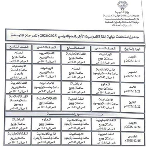 الرئيسية » الخدمات » خدمات تعليمية » جدول اختبارات الفصل الأول 2025 جدول اختبارات الفصل الأول 2025 Updated on تتيح هذه الخدمة إمكانية الاطلاع على جدول اختبارات الفصل الأول 2025، وذلك من خلال الجدول التالي: Share on ... Facebook Messenger WhatsApp Telegram Twitter More Copy link Short link